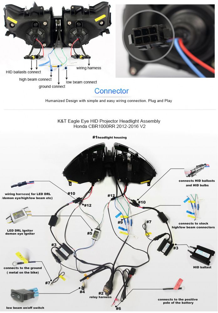 2: ближний свет и светодиод Demon Eye: переключатель включения / выключения ближнего света, установленный жгутом реле KT, его можно использовать для управления включением и выключением ближнего света и демона.