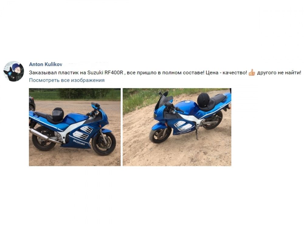 ㋛ В данный комплект пластика для мотоцикла Suzuki RF400/600/900 1993-1999 входят абсолютно все детали пластиковых элементов облицовки мотоцикла: передний пластик, боковой пластик, переднее крыло, пластик хвоста, накладки воздуховодов, внутренний пластик обтекателя. Точную комплектацию уточняйте, пожалуйста, у менеджеров магазина.